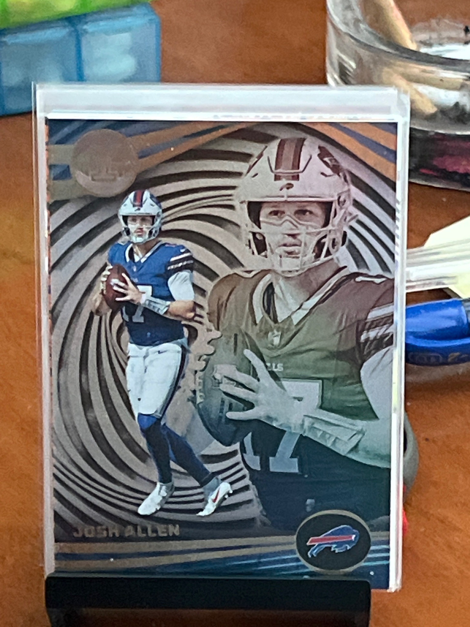 This is a 2020 Panini Illusions trading card featuring Buffalo Bills quarterback Josh Allen. The card showcases a dual-image design characteristic of the Illusions brand, which utilizes a 3D lenticular-style aesthetic on a thick cardstock base. The background features a distinctive copper and brown swirling vortex pattern. The left side displays a full-body action shot of Allen in his white away jersey, while the right side features a larger, cropped close-up portrait in a home blue jersey. The player's name 'JOSH ALLEN' is embossed in gold foil at the bottom left, and the Buffalo Bills team logo is featured in a circular metallic gold-bordered emblem at the bottom right. The Panini Illusions brand logo is visible in the top left corner. The card appears to be in Excellent to Near Mint condition; it is currently housed in a transparent soft sleeve and a rigid top-loader for protection. The corners look sharp, and the centering appears balanced, though a professional grading would be required for a definitive surface and edge assessment. The metallic foil accents show good luster without visible pitting or oxidation.