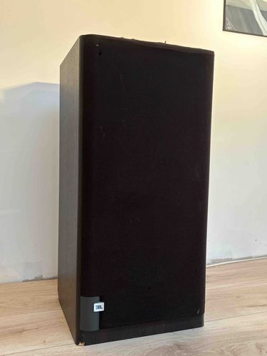 This is a substantial floorstanding loudspeaker from the famous JBL Northridge E-Series, likely an E80 or E90 model produced in the early to mid-2000s. The unit features a large, rectangular tower construction with a dark wood-grain vinyl wrap or veneer over a heavy MDF (Medium Density Fiberboard) cabinet. The front is dominated by a full-length, black fabric removable grille. A distinctive design element is the silver-toned JBL logo badge positioned on a grey plastic accent piece at the bottom left of the grille. In terms of condition, visible wear is present: there appears to be minor fraying or dust accumulation on the top edge of the speaker grille, and a significant chip or impact mark is visible on the bottom left corner base, exposing the underlying lighter wood or pressboard. This indicates heavy use or movement during its lifespan. These speakers are known for their 'PolyPlas' woofers and heat-free titanium-laminate tweeters, representing a mid-range consumer audio product known for high output and durability. The overall craftmanship is typical of high-volume manufacturing from that era—sturdy and functional but showing age-related aesthetic degradation in the outer skins and edges.