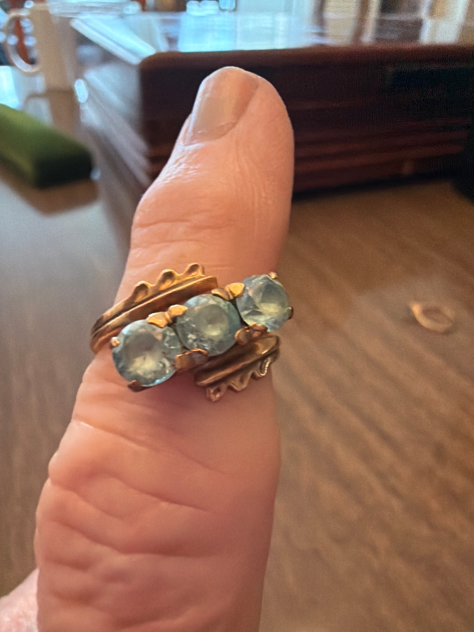 This is a vintage three-stone ring featuring three round brilliant-cut light blue gemstones, likely aquamarines, set in what appears to be a 10K or 14K yellow gold mounting. The stones are arranged in a horizontal row across the finger, held by four traditional prongs for each gemstone. Flanking the central stone setting are distinctive gold decorative elements featuring a scalloped or wavy edge, which suggests a Retro or mid-20th-century aesthetic (circa 1940s-1960s). The gold has a warm, yellow tone with a subtle patina consistent with age. Upon inspection, the gemstones show some surface wear and micro-abrasion along the facet edges (junctions), which is common for beryl-group stones that have been worn frequently. The band is relatively thin, indicating some wear from friction against the skin or other rings. No visible maker’s marks are discernible from this angle, though they likely reside on the inner shank. The overall craftsmanship is representative of mid-century commercial fine jewelry, focusing on bold shapes and the color contrast between the cool blue gems and the warm gold metal.