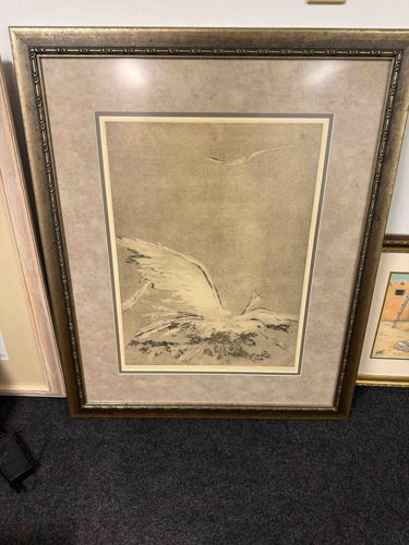 This is a large-format framed art print featuring an ethereal, gestural depiction of a bird in flight. The central image is rendered in white and soft gray tones against a textured, taupe-colored background, giving it a dreamlike or atmospheric quality. Stylistically, it appears to be a contemporary or late 20th-century decorative piece. The artwork is housed within a substantial wooden or composite frame featuring a metallic bronze and gold patina with a continuous bead-and-reel or egg-and-dart decorative molding along the inner edge. A wide, mottled gray or stone-textured mat surrounds the primary image, with a thin secondary inner border or fillet that provides visual depth. The overall scale of the piece is significant, likely exceeding 30 inches in height. The craftsmanship of the framing is professional, utilizing archival-style matting. There are no immediate signs of significant damage such as moisture ingress or frame separation, though minor surface wear on the metallic finish of the frame corners is consistent with handling. No specific signature is discernible from the viewing distance, suggesting it might be a mass-produced high-end decorative decor item or a limited edition lithograph from a commercial gallery.