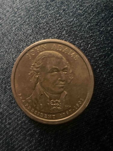 This is a United States one-dollar coin from the Presidential $1 Coin Program, specifically featuring the likeness of John Adams, the second U.S. President. The coin's physical characteristics include a diameter of 26.5mm and a weight of approximately 8.1 grams. It is composed of a manganese-brass alloy over a pure copper core, giving it a distinctive golden-hue finish. The obverse side displays a three-quarter profile portrait of John Adams designed by Joel Iskowitz and sculpted by Charles Vickers. The text 'JOHN ADAMS' is inscribed at the top, and '2nd PRESIDENT 1797-1801' is curved along the bottom. Notable features of this series include edge-incused lettering for the year, mint mark, and 'E PLURIBUS UNUM,' though these are not visible from this top-down perspective. The visible condition shows signs of significant circulation, including surface wear, minor scratches (bag marks), and a dulling of the original luster with visible dark oxidation or patina. There are small nicks along the raised rim. The craftsmanship reflects modern industrial minting techniques with high-relief details in the portraiture. Based on the appearance, this appears to be a Philadelphia (P) mint strike from 2007.