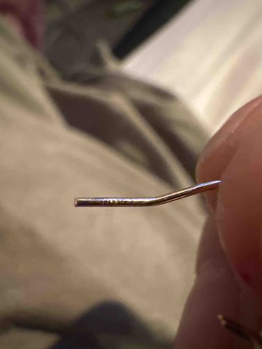 This item is a single jewelry component, specifically a metal post belonging to an earring, likely of a 'fish hook' or 'shepherd hook' style based on the visible curvature. The post is constructed from a yellow-toned metal alloy and features a distinct stamped hallmark indicating purity. The hallmark, while slightly distorted due to the surface curvature, appears to read '14K', signifying that the piece is composed of 14-karat gold (approximately 58.3% gold content). The post exhibits a slight bend or crimp approximately 5mm from the end, which is a common stress point for wire-style earrings frequently handled for insertion. The surface of the metal shows subtle micro-scratching consistent with regular wear and use. There are no visible maker's marks or designer signatures beyond the purity stamp. The style is utilitarian and contemporary, common in fine jewelry manufacturing from the late 20th century to the present. The gauge of the wire is standard for pierced ears, approximately 0.8mm to 1mm in diameter. The coloration is a bright, classic yellow gold with a polished finish, indicating high-quality finishing despite its small size. The construction is solid wire, not hollow, which provides necessary structural integrity for a component intended to pass through the earlobe.
