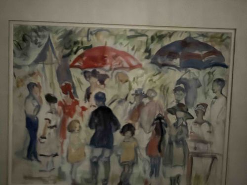 This artwork is a medium-scale watercolor painting on paper, executed in a loose, Impressionistic or Post-Impressionistic style. The composition depicts a vibrant outdoor gathering of figures, likely at a park, beach, or market. Dominating the upper portion of the frame are two large, colorful umbrellas—one a bold red and the other a striped blue and purple hue—which serve as focal points. The figures are rendered with gestural, fluid brushstrokes rather than precise anatomical detail, emphasizing movement and light. A palette of soft greens, blues, and earth tones in the background contrasts with the more saturated primaries of the clothing and umbrellas. The medium appears to be watercolor or gouache, characterized by its transparency and the way it utilizes the white of the paper for highlights. The piece is housed within a neutral-toned mat, though the frame is partially obscured. Visible condition appears fair; there is slight waving of the paper substrate, often indicative of moisture exposure or improper mounting. No immediate signature or artist mark is clearly visible in this photograph, but the stylistic execution suggests a mid-20th-century origin, inspired by early modern masters. The brushwork shows significant confidence, with wet-on-wet techniques creating soft transitions between the figures and the environment.