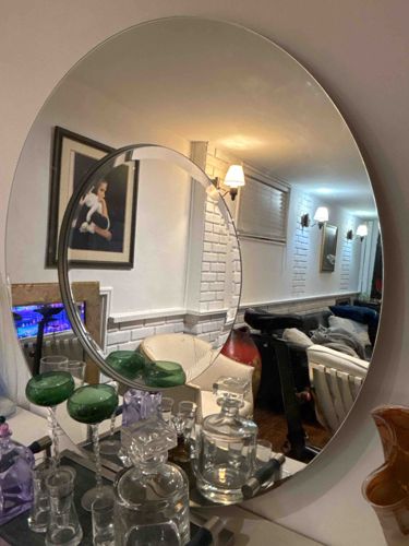 This item is a contemporary circular wall mirror featuring a unique 'mirror-on-mirror' design. The piece consists of a large, primary circular mirror plate with a smaller, secondary circular mirror inset or layered onto the left side of the main surface. The smaller mirror features a pronounced wide beveled edge, which creates a lens-like refraction effect and adds significant depth and geometric interest to the piece. The overall construction is frameless with polished edges, emphasizing a sleek, minimalist aesthetic typical of mid-to-late 20th-century or early 21st-century modern design. The glass appears to be in good clarity without visible signs of silvering desilverization or 'black edge.' The craftsmanship is evident in the precise alignment of the inset element and the high-quality polish of the beveled perimeter. There are no visible chips, cracks, or deep scratches on the reflective surfaces. The mounting system is concealed behind the glass, contributing to its floating appearance against the wall. The style is reminiscent of Italian modernist mirrors or high-end boutique furniture pieces from the 1980s to the present day.