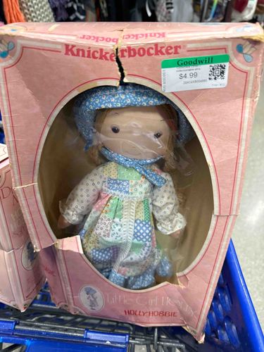This is a vintage Holly Hobbie soft rag doll manufactured by Knickerbocker, estimated to date from the mid-1970s. The doll is presented in its original pink cardboard window display box. The doll features a screen-printed fabric face with simple dot eyes and a soft, stuffed body. She is wearing her characteristic bonnet in blue floral print and a patchwork-patterned dress with vertical lace detailing and ruffled sleeves, reflecting the popular American Greetings 'rag doll' aesthetic of that era. The clothing is constructed from light cotton or poly-cotton blends in pastel shades of blue, yellow, and green. The packaging heavily impacts the overall appraisal: the box is in poor to fair condition, showing significant structural damage including a large vertical tear at the top center, creasing, and edge wear. A modern Goodwill price tag is affixed to the front upper right, and the original clear plastic window is wrinkled and dusty. While the doll itself appears to be in relatively clean, unplayed-with condition inside the box, the severe degradation of the retail packaging and the presence of adhesive residues from price tags are notable condition issues that reduce its value to a mint-in-box collector.