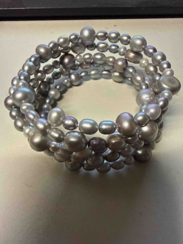This item is a contemporary multi-tier wrap bracelet composed of genuine freshwater pearls. The piece features approximately five to six integrated coils, designed in a memory-wire or flexible wrap style that accommodates various wrist sizes without the need for a traditional clasp. The pearls exhibit a sophisticated palette of silver-grey tones, ranging from light iridescent silver to deeper metallic pewter hues with moderate to high luster. The pearls are predominantly baroque, button, and semi-round in shape, displaying the natural irregularities and surface ridges characteristic of freshwater mollusks. The arrangement thoughtfully varies pearl sizes, alternating between smaller seed-like pearls (approx. 4-5mm) and larger focal pearls (approx. 8-10mm) to create a dynamic, textured aesthetic. In terms of condition, the pearls appear well-maintained with no visible chipping of the nacre, though natural organic surface pits are present, which are expected in authentic baroque pearls. The underlying structure appears to be a flexible metallic wire, likely stainless steel or silver-toned alloy, which retains its tension well. This style is consistent with late 20th to early 21st-century jewelry design, emphasizing organic materials and ergonomic wearability. Craftsmanship is evidenced by the consistent drill holes and the rhythmic distribution of pearl shapes across the multiple tiers.