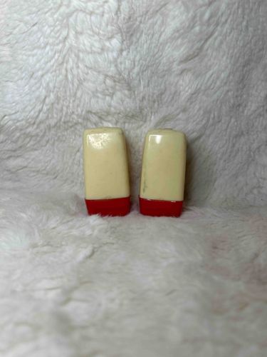 This is a pair of vintage salt and pepper shakers featuring a classic Mid-Century Modern aesthetic. These shakers are constructed from a two-tone plastic, likely Catalin or Bakelite, which was popular in the 1930s through the 1950s. The main bodies are an elongated, rectangular form with rounded shoulders and a cream-colored or butterscotch finish. The bases are a vibrant, contrasting cherry red. The overall height appears to be approximately 2.5 to 3 inches. The construction is typical of Art Deco-influenced tabletop items, focusing on clean lines and bold color blocks. In terms of condition, there is visible surface wear including minor scuffing, localized discoloration, and small dark specks which are common in aged phenolic resins. The left shaker displays some slight patina or grime accumulation near the top edge. There are no obvious cracks or catastrophic chips visible from the primary angle, though the bottom edges show some slight roughness consistent with use. The smooth, polished finish suggests a higher quality of early synthetic manufacturing. No maker's marks are visible on the exterior faces; such marks were often located on the underside or integrated into the screw-on caps if present. This set exemplifies the Streamline Moderne style of mid-20th-century kitchenware design.