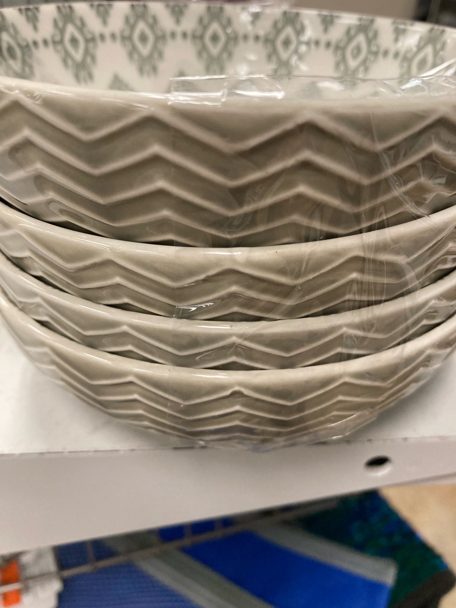 This is a set of four stacked ceramic stoneware bowls, likely part of a nested serving or dining collection. The exterior of each bowl features a distinct, debossed chevron or 'zig-zag' relief pattern that provides a tactile, matte texture in a neutral greige (grey-beige) tone. The interior of the uppermost bowl displays a contrasting glazed finish with a printed geometric ikat or diamond pattern in a sage green hue against a crisp white background. Each bowl appears to be of standard cereal or soup size, approximately 6 inches in diameter. The construction is heavy-set stoneware, characteristic of mass-marketed durable kitchenware. Based on the provided context, the items are marked 'Made in China' by Signature Housewares. The condition appears to be new-old-stock or excellent retail condition, as they are currently bound together in original protective clear plastic shrink-wrap, which has prevented surface scratching or 'flea bites' common in stacked ceramics. There is no visible crazing, chipping, or glazing defects. These modern pieces were likely manufactured within the last 10-15 years, following contemporary trends in mixed-pattern bohemian and Scandinavian kitchen aesthetics.