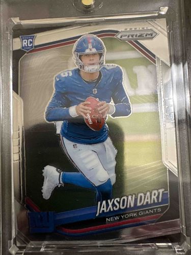 This is a standard 2.5 by 3.5 inch custom-made sports trading card intended to mimic the Panini Prizm brand aesthetic. The card features an image of quarterback Jaxson Dart in a New York Giants uniform, despite him currently playing collegiate football. The construction utilizes a glossy, metallic-style 'Prizm' finish with a silver/chrome border. Key visual markers include the 'Prizm' logo in the upper right, a 'Rookie Card' (RC) shield icon in the upper left, and the player's name and team 'New York Giants' along the bottom edge. Notable is the artistic alteration; Dart has not played for the Giants, indicating this is a custom 'ACE' or fan-made card rather than a factory-sealed licensed product. The card is encased in a protective magnetic one-touch hard case, which appears to be in excellent condition. The card itself shows sharp corners and clean edges through the case, with no visible surface scratches, though custom cards lack the official holographic security stamps of authentic Panini releases. This contemporary piece represents a modern trend in the hobby for 'prospecting' or creating 'what-if' cards for popular college athletes before they enter the NFL draft.