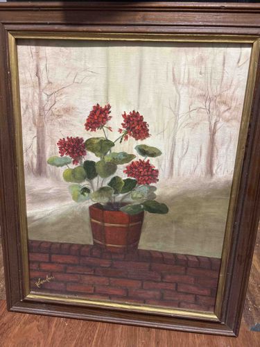 This original oil or acrylic painting on canvas depicts a vibrant cluster of red geranium flowers in a rustic wooden barrel-style pot. The central subject rests upon a detailed red brick ledge or wall in the foreground. The background is rendered in a soft, impressionistic style with muted tones of beige, cream, and grey, suggesting a misty or early morning woodland scene with bare, slender trees. The work is signed in the lower left corner with the cursive signature 'S. Clowers'. The painting exhibits visible canvas texture throughout, indicating a medium-weight textile support. The color palette centers on the deep crimson of the petals and the lush green of the scalloped leaves, contrasting sharply with the desaturated background. The piece is housed in a period-appropriate mid-to-late 20th-century wooden frame featuring a dark walnut-stained outer molding and a metallic gold-painted inner liner (fillet). Regarding condition, the canvas appears taut with no obvious punctures, though there is minor surface dust and slight scuffing consistent with age. The frame shows some minor gapping in the mitered corners and small abrasions to the wood finish. The artist, Sandra Clowers, demonstrates a representational folk-art influence with attention to botanical symmetry and structural perspective in the brickwork.