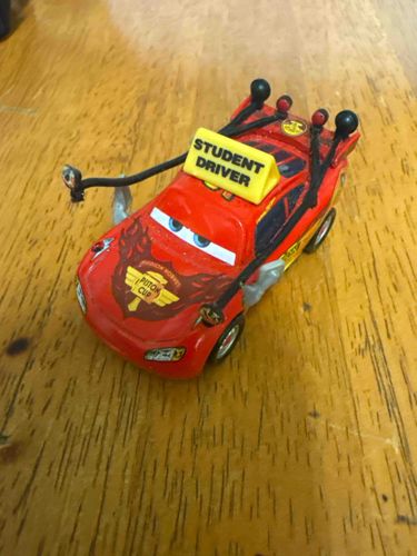 This item is a 1:55 scale die-cast toy vehicle representing Lightning McQueen in his 'Chester Whipplefilter' undercover persona from the Disney Pixar 'Cars 3' Thunder Hollow demolition derby scene. The car features a vibrant red base color with stylized brown and yellow graphics on the hood and sides, including a 'Piston Cup' logo variant. A prominent yellow 'STUDENT DRIVER' roof sign is mounted on top. The car is equipped with complex black structural rigging extending across the roof and hood, terminating in spherical attachment points. The construction is primarily die-cast metal with plastic components for the accessories, wheels, and interior. Notable features include expressive character eyes on the windshield and simulated muddy/worn paint details consistent with the demolition derby theme. The condition appears used but fair, with visible paint chips on the front bumper and several points of wear along the edges of the metal body. The black plastic rigging shows some slight deformation but remains intact. Manufactured by Mattel, this piece dates from approximately 2017 or later, reflecting the release period of the 'Cars 3' collectible line.