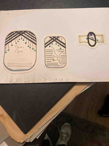 A set of three hand-drawn commercial illustration mockups on paper, created by Monika Adams on November 3, 1981, for a project at Shawnee State University (SSU) under the instruction of Debbi van Warmer. The pieces consist of two primary container labels and one neck-style band, likely intended for a wine or natural beverage product. The illustrations feature a consistent trellis or arbor motif with black diagonal latticework, accented by green vine-like elements and delicate floral or grape-like drops. The center-left label contains the handwritten brand name 'Nature's Choice' in a serif font, while the middle label provides a template for ingredients or nutrition facts with horizontal lines. The third smaller label on the right features a circular logo with a botanical illustration and the date '1982'. The artwork is rendered using ink and possibly colored pencil on cream-colored cardstock. The condition shows significant foxing and moisture staining along the lower horizontal edge of the mounting sheet, suggesting long-term storage in a humid environment. Despite the aging of the paper support, the colors and fine lines of the illustrations remain legible. This serves as a significant record of student commercial design work from the early 1980s.