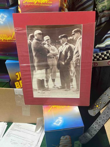 This item is a black and white photograph featuring legendary baseball figures Ty Cobb and Tristram Speaker, along with two other unidentified men in period-accurate suits and caps. The central figure, Cobb, is seen wearing a heavy knit sweater and baseball pants, characteristic of the early 20th-century athletic aesthetic. The photograph appears to be a modern or mid-century reproduction rather than an original silver gelatin print from the era, evidenced by the tonal quality and presentation. It is mounted within a rectangular red cardstock matting. The matting shows visible signs of wear, including creasing and a distinct horizontal line of adhesive tape across the center, which obscures part of the image and the mat itself. The condition of the matting is fair to poor due to the tape residue and surface scuffs, though the image itself shows good contrast with visible details in the textures of the clothing. There are no visible maker's marks, signatures, or embossed stamps on the front of the image or the mat. The framing style and the subjects suggest an estimated age for the original scene in the 1910s-1920s, while the physical object likely dates to the late 20th century.