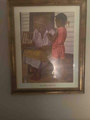 This is a framed art print titled 'Grandma and Me' by contemporary artist Keith Mallett. The scene depicts an elderly woman, likely the grandmother, sitting in a wooden chair indoors, reading or working on a lap project, while a young girl in a coral-colored sleeveless top and shorts stands beside her, touching her hair. The print features a warm, muted palette of browns, lavenders, and earthy tones, typical of Mallett's figurative style which often explores themes of family and African American heritage. The artwork is presented with a wide white matte that includes the title 'Grandma and Me' centered at the bottom in a cursive script. It is encased in a decorative gold-toned wooden frame that features a beaded inner border. The frame appears to have a distressed or antiqued finish with some darker patina in the recessed areas. The construction suggests late 20th to early 21st-century production. Visible condition is good with no apparent fading or moisture damage to the print, though there is a noticeable circular glare on the glass from the camera flash. The matting appears clean, and the frame shows minor wear consistent with residential display. While this appears to be an open-edition lithographic print rather than an original painting, the quality of Mallett's compositions makes this a popular decorative piece.