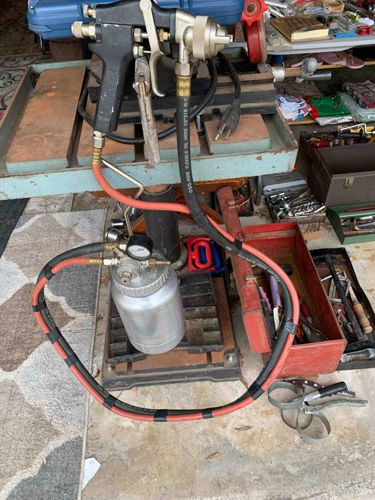 This is a pneumatic pressure-feed spray gun assembly, commonly utilized in automotive and industrial painting. The kit includes a high-capacity cast aluminum pressure pot (paint tank) equipped with a top-mounted pressure regulator and a small analog pressure gauge. The spray gun itself features a professional-grade, heavy-duty black anodized body with a silver metallic nozzle assembly and a metal trigger. A dual-hose system (twin line) connects the tank to the gun: a red air hose for atomization and a black reinforced fluid hose for paint delivery. The hoses are secured together with black tape for easier handling. The construction is characterized by knurled adjustment knobs for fluid and fan control, indicative of mid-to-late 20th-century professional-grade equipment. The overall condition shows signs of moderate use, with visible paint residue on the spray head, minor surface oxidation on the pressure pot lid, and scuffing on the handgun handle. The setup is resting on a workshop drill press table, surrounded by various tools, suggesting it is a functional piece of workshop equipment. While no manufacturer stamp is clearly legible, the design is consistent with brands like Binks, DeVilbiss, or Sharpe from the 1980s or 1990s.