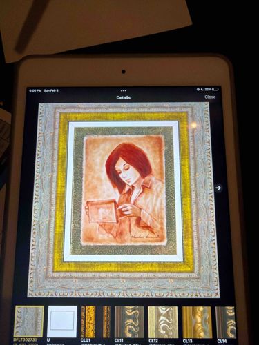 This item is a contemporary mixed media painting by the artist Charles Lee, depicting a monochromatic sepia-toned figurative scene. The artwork features a woman with short reddish hair, dressed in a collared shirt, holding and observing a rectangular object, possibly a photograph or a small frame. The central image is rendered with expressive brushwork and soft gradients, primarily in shades of burnt sienna and ochre. It is housed within a complex and elaborate multi-layered framing system that serves as a hallmark of the artist's commercial style. The framing includes a wide textured gold-leaf inner border, followed by a white beveled mat, and an outer ornate silver-tone frame with scrollwork details and patinated flourishes. The signature 'Charles Lee' is clearly visible in the lower right quadrant of the canvas in a cursive, fluid hand. The overall composition suggests a late 20th to early 21st-century production, typical of high-end gallery décor. The condition appear excellent as viewed via digital display, with no visible craquelure, fading, or structural damage to the ornate molding. The use of mixed media, likely including oil or acrylic with possible lithographic elements, indicates a professional level of craftsmanship aimed at the luxury home furnishings market.