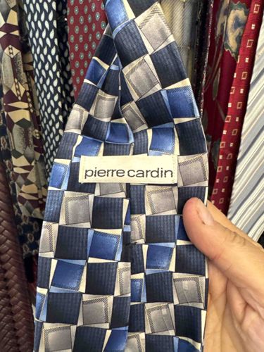 This is a vintage Pierre Cardin men's necktie featuring a sophisticated geometric patchwork design. The pattern consists of overlapping square and rectangular blocks in varying shades of navy blue, royal blue, silver-grey, and black. A subtle micro-grid or ribbed texture is visible within several of the blue and grey panels, indicating a jacquard weave likely made from 100% silk. The construction shows a standard three-fold design with a visible brand loop/keeper on the reverse featuring the classic 'pierre cardin' lowercase typography in black on a cream background. The tie's width appears to be representative of 1990s or early 2000s fashion. The condition appears well-maintained, with no immediate signs of fraying at the edges or heavy staining, though light creasing is visible near the knot area from previous wear. The stitching on the brand label is intact, which serves as a quality indicator for authentic designer apparel from this era. This accessory demonstrates the brand's mid-to-late century modernist influence applied to traditional office attire.