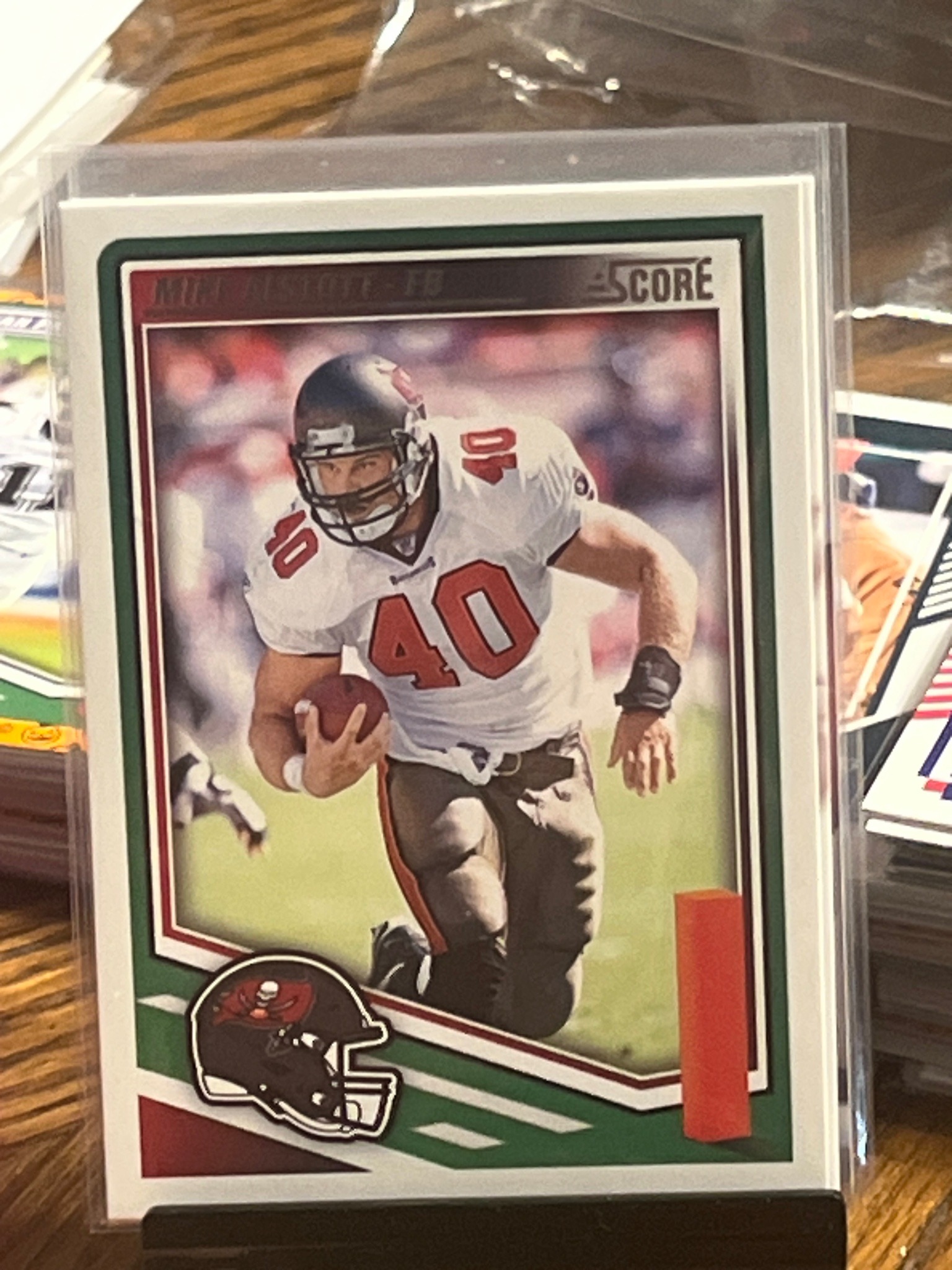 This is a standard 2.5 by 3.5-inch trading card featuring Mike Alstott, the American football fullback for the Tampa Bay Buccaneers. The card belongs to the 2007 Score football series, manufactured by Panini. The design features a white outer border and an inner green and pewter-colored frame. The central image depicts Alstott in his white away jersey with red number 40, running with the football against a stadium background. The 'Score' brand logo is visible in the upper-right corner, while Alstott's name and position (FB) are printed in a red banner at the top. The bottom left features a helmet-style logo of the Tampa Bay Buccaneers in use during that era. The card is printed on semi-gloss cardstock. In terms of condition, the card appears to be in very good to near-mint state, currently housed in a clear protective plastic sleeve and top-loader. The centering appears slightly heavy toward the left and bottom borders. The edges and corners visible through the sleeve appear sharp with no obvious signs of whitening or fraying. There are no visible surface scratches, creases, or fading to the ink pigments. This card celebrates one of the most prominent fullbacks in NFL history during the twilight of his career, as 2007 was the year Alstott officially retired.