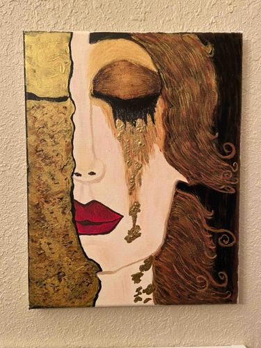This contemporary artwork is an unframed mixed media painting on stretched canvas, featuring a stylized and abstract depiction of a female face in profile. The composition is divided vertically; the left side features heavy, impasto gold texture with black kontours, while the right side displays a woman with flowing brown hair, deep red lips, and a closed eye shedding golden tears. The materials appear to include acrylic or oil paint combined with metallic gold leaf or high-viscosity gold acrylic to create significant texture. The background on the right is a stark black, providing high contrast against the pale skin tones and vibrant gold. Notable craftsmanship is seen in the swirling patterns of the hair and the deliberate dripping effect of the golden tears. The condition appears to be excellent with no visible signs of cracking, fading, or surface damage. The style is heavily influenced by Art Nouveau, specifically reminiscent of Gustav Klimt's decorative use of gold and organic shapes. There are no clearly visible artist signatures or maker's marks on the front surface. The piece appears to be a modern creation, likely within the last 10-20 years, showcasing a blend of figurative and abstract expressionism through its emotive subject matter and bold use of metallic accents.