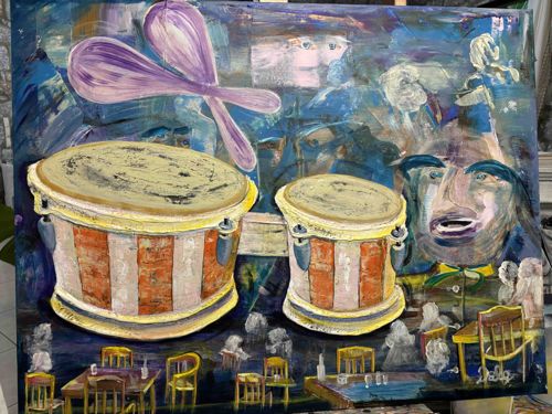This is an original large-scale expressionist painting on canvas, measuring approximately 100cm by 70cm, created by the artist Dale Haessly. The composition is highly complex and layered, featuring two prominent conga drums in the foreground with vertical orange and white stripes. Above the drums, a pair of large, abstracted purple mallets or drumsticks float against a chaotic, multi-tonal blue and violet background. To the right, a stylized, large face with thick teal eyebrows and a wide-set mouth is integrated into the middle ground. The bottom of the canvas depicts a social setting with several small tables, chairs, and ghost-like figures, suggesting a nightclub or cafe atmosphere. The brushwork is vigorous and impasto-heavy, particularly on the drum heads and the facial features, showing significant texture and hand-application. The palette is vibrant, utilizing a mix of cool blues and purples contrasted with warm yellows and oranges. The piece is signed 'Dale' in the lower right corner in white paint. The condition appears stable with no visible tears or excessive cracking, though the raw edges suggest it may be an unframed gallery-wrapped canvas. The style is contemporary expressionism, marked by dreamlike proportions and fluid layering of subjects.