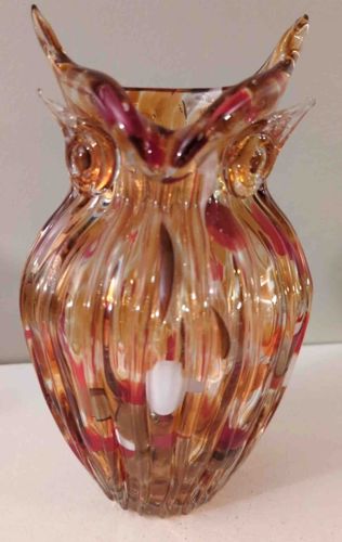 This is a decorative hand-blown art glass vase sculpted into the stylized form of an owl. The piece features a vibrant multi-colored palette within clear glass, utilizing a 'macchie' or spotted technique. Dominant colors include amber, mahogany red, brown, and opaque white patches suspended in a translucent glass matrix. The vessel's exterior is characterized by heavy vertical ribbing or 'pince' work, which creates a textured surface mimicking feathers and provides structural depth. The owl's facial features are defined by two applied clear glass concentric rings representing eyes and distinct, pointed 'ear' tufts formed by pulling the hot glass upwards during the cooling process. The base narrows significantly to a small, slightly flattened bottom. Craftsmanship suggests a mid-to-late 20th-century origin, likely Italian (Murano) or influenced by Murano techniques such as those seen in Seguso or Archimede Seguso designs. The condition appears to be excellent with no visible chips, cracks, or significant surface abrasions, though some internal striations and air bubbles are present as a natural byproduct of the artisanal blowing process. The lack of visible maker's marks or signatures suggests an uncredited studio piece or a higher-end export item from the 1960s-1970s period.
