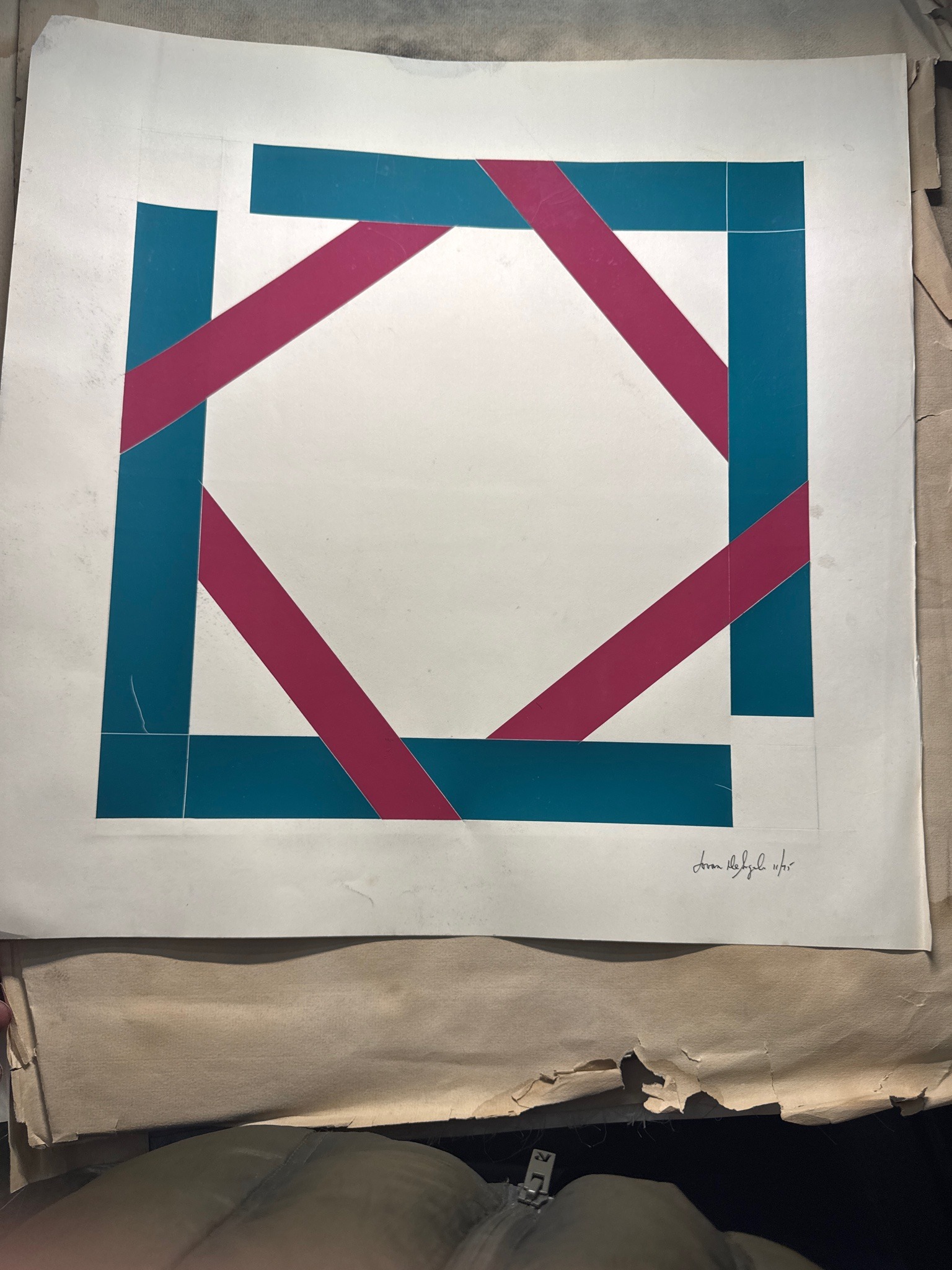 This is a 20th-century geometric abstract print on heavy white paper, likely a serigraph or screenprint, dated 1975. The composition features a bold interaction of teal and magenta diagonal and rectilinear bands that form a centralized, interlocking square frame. Notably, the artist's original pencil guidelines and layout marks are visible surrounding the blocks of color, suggesting either a working proof or an intentional exposure of the technical process. The piece is hand-signed in the lower right corner by 'Aaron De Angeli' and dated '11/75'. Physically, the artwork shows significant condition issues including multiple creases across the lower third, visible surface smudging, and handling marks (foxing/soiling) along the margins. The edges are uneven, with the bottom margin showing severe tearing and deterioration where it rests on a secondary, aged backing sheet. Despite these issues, the ink remains vibrant with sharp registration typical of mid-century minimalist and hard-edge geometric styles common in the 1970s art market.