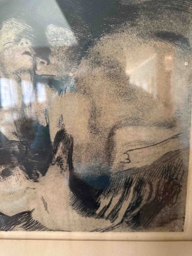 This artwork is a figurative composition executed in an intaglio printmaking technique, likely a combination of etching, aquatint, and drypoint. The piece features two human figures depicted in a highly expressive, semi-abstracted style. The upper figure shows a head tilted back with closed eyes, conveying a sense of ecstasy, sleep, or despair. The palette is muted and somber, dominated by deep charcoal blacks and sepias, with subtle blue undertones visible in the mid-section. The construction utilizes heavy cross-hatching and stippled textures to build depth and form, characteristic of mid-20th-century European expressionism. A visible signature or monogram is located in the lower right corner, appearing as a stylized 'S' or 'JD' cursive mark, though it requires further forensic study for definitive attribution. The paper shows natural age-toning and slight yellowing, particularly along the margins under the protective glass. There is some minor foxing and surface humidity marks visible on the paper substrate. The print is housed behind glass in a simple frame, which shows light surface wear commensurate with age. The dramatic use of light and shadow (chiaroscuro) and the raw emotionality suggest an artist working in the post-war tradition, possibly of the German or Eastern European schools, circa 1950-1970.