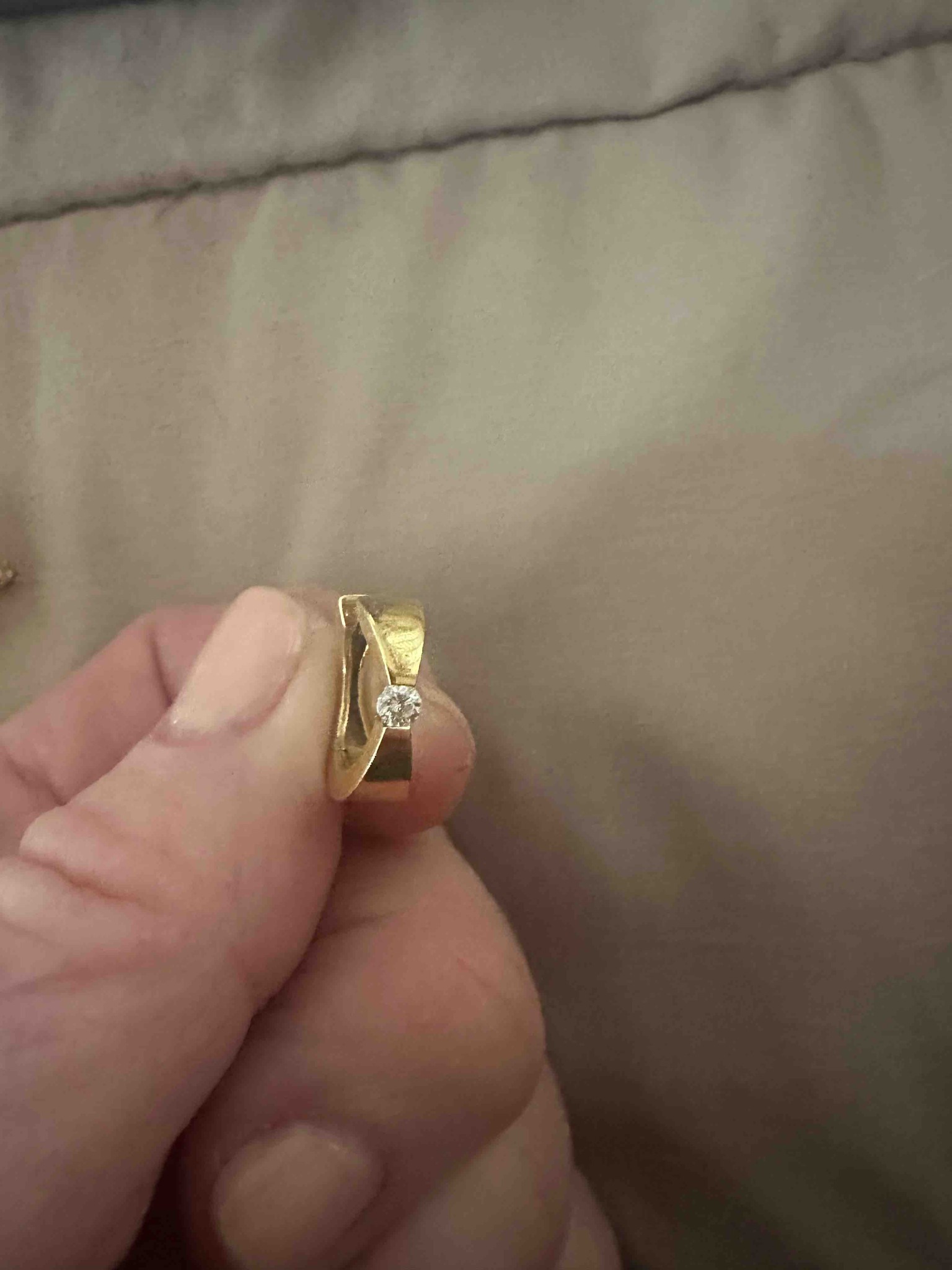 This item is a modernist-style hoop earring crafted from yellow gold, featuring a single round brilliant-cut diamond. The earring showcases a unique architectural design where two wide, flat bands of gold overlap and taper slightly at the center. The diamond is secured using a tension-setting technique, suspended between the two metal ends, which allows for maximum light entry and visibility of the stone. The gold exhibits a warm, high-karat yellow hue and a polished finish that shows surface micro-abrasions and minor light scratches consistent with regular wear. The construction appears sturdy, with the metal bands having a significant thickness and flat edges. There are no visible hallmarks or maker's marks on the outer surfaces shown, which is typical for small jewelry items where stamps are often placed on the post or internal hinge. The contemporary aesthetic suggests it was manufactured in the late 20th to early 21st century. The diamond appears to be approximately 0.10 to 0.15 carats, though precise measurement and grading of clarity and color are limited by the photographic resolution. The overall craftsmanship indicates a high-quality, designer-inspired piece characterized by clean lines and technical setting precision.