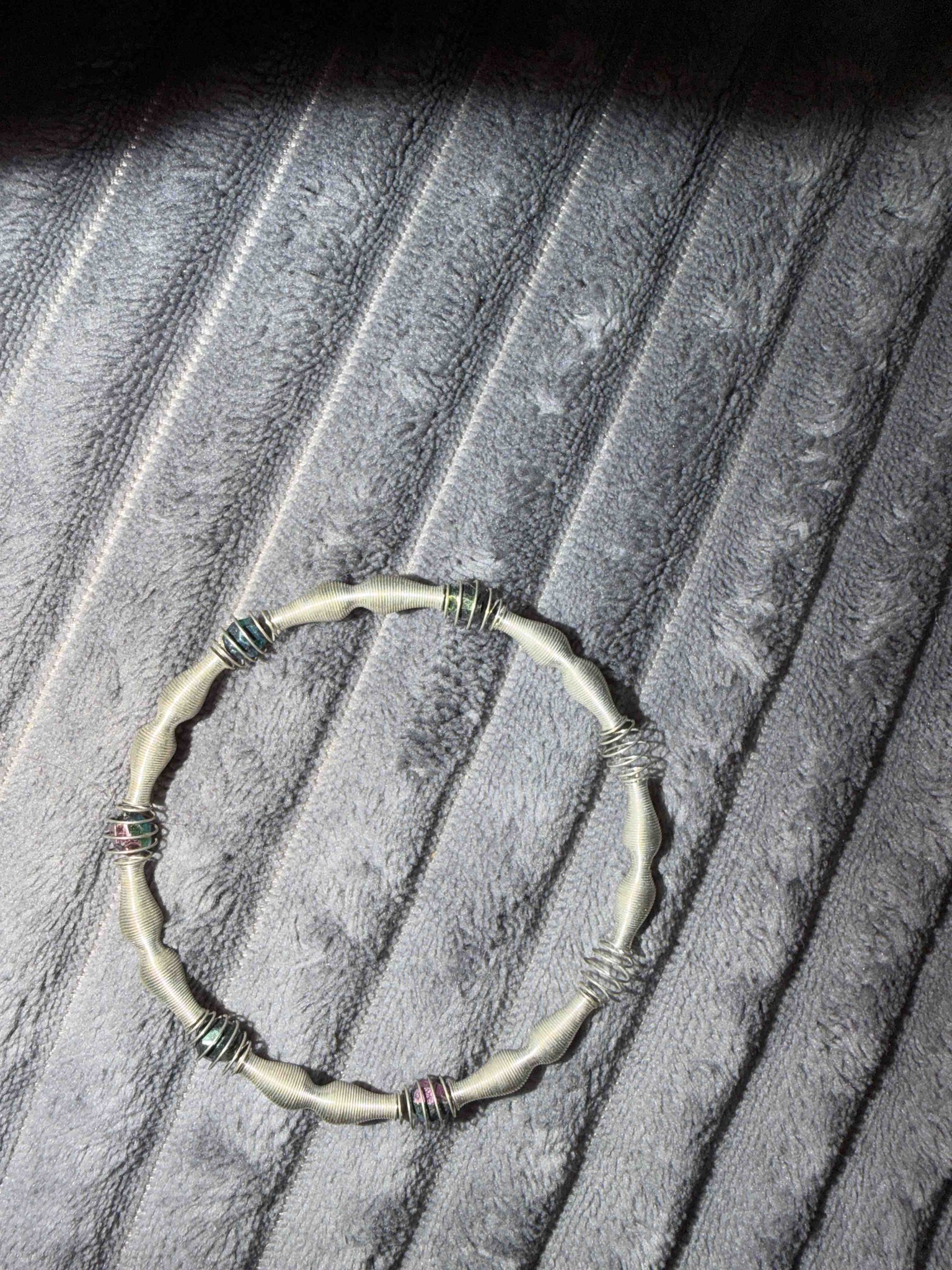 This is a circular bangle featuring a distinctive coiled-wire construction, characteristic of artisan jewelry from East Africa, specifically the Maasai tradition. The item is composed of a continuous base wire tightly wrapped with a fine silver-toned or steel wire, creating a rhythmic, undulating ribbed texture along the circumference. Interspersed among the coiled sections are five decorative wire-caged segments. Each cage holds small glass or stone beads in alternating hues of deep emerald green and amethyst purple. The construction shows high manual dexterity with the coils transitioning from tight, dense wraps to wider, spiral 'cages' that secure the beads in place. There are also two sections where the wire appears slightly loosened or stretched, likely serving as the start/end points of the wrapping or acting as flexible expansion joints. The metal exhibits a bright, cool luster with minimal oxidation, suggesting a contemporary 20th to 21st-century production. Condition is generally good, though some minor irregular spacing in the coils indicates hand-crafted origin rather than factory machining. No maker's marks are visible, which is standard for this style of ethnographic folk art jewelry.