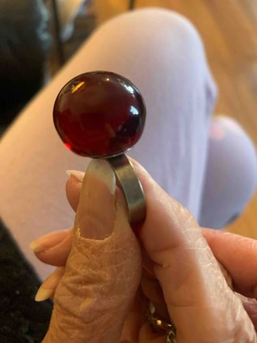 This is a contemporary or modernist-style cocktail ring featuring a large, spherical orb as its central focal point. The orb appears to be made of a deep cherry red or oxblood synthetic material, possibly glass or high-quality acrylic, which exhibits a translucency that glows when catching light. The sphere is approximately 18-22mm in diameter and is securely mounted onto a simple, wide metal band. The band has a matte, brushed, or oxidized finish, suggesting it is made of sterling silver with an intentional patina or perhaps a base metal alloy like pewter or surgical steel. The construction is minimalist and geometric, aligning with mid-century modern or 1970s brutalist jewelry aesthetics. There are no visible maker's marks or hallmarks in the provided perspective, but the overall craftsmanship appears solid with a smooth, seamless join between the orb and the mount. Condition-wise, the band shows some superficial surface scratching and dullness consistent with light wear, while the red orb remains highly polished and free of significant chips or abrasions. This style is characteristic of art-house jewelry design, prioritizing bold shapes and light-play over traditional ornate gemstone settings.