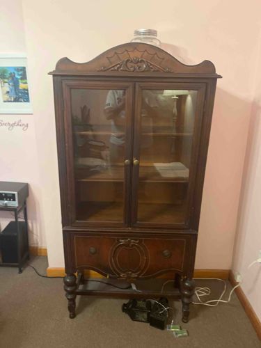 This is a vintage wood china cabinet, likely dating from the 1920s to 1940s during the American Revival period. The piece is constructed from mahogany or a similar dark-stained hardwood, featuring a tall, vertical profile. The uppermost section is defined by a decorative broken-arch or demi-lune pediment with ornate central wood carvings and sunburst-style incised detailing. Below the pediment, two large glass-fronted doors open to reveal an interior with three wooden shelves designed for display. The lower section includes a single large drawer adorned with a central oval cartouche featuring decorative moldings and two small brass or wooden pull knobs. The cabinet is supported by four turned 'ball and claw' or bulbous-style legs connected by a simple H-stretcher for structural stability. Its finish displays a rich, deep patina with visible signs of age-appropriate wear, including minor scuffs along the base and edges. The overall craftsmanship reflects early 20th-century mass-production techniques that emulated high-end 18th-century English furniture designs, emphasizing classical symmetry and intricate wood ornamentation.