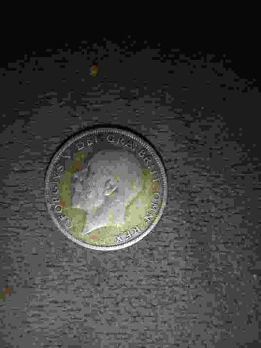 This item is a historical British silver coin featuring the profile of King George V on the obverse side. The coin is circular in shape with a reeded or denticulated edge along the rim. The central figure is the left-facing bust of King George V, characterized by his mustache and beard, rendered in a relief style typical of early 20th-century British coinage (circa 1911-1936). Surrounding the portrait is the Latin inscription 'GEORGIVS V DEI GRA: BRITT: OMN: REX', which translates to 'George V, by the Grace of God, King of all the Britains'. The silver material displays a significant amount of natural toning and oxidation, resulting in a dark, aged patina with greenish-yellow hues appearing in the recessed areas. The surfaces show evidence of moderate circulation, with wear visible on the high points of the King's hair and beard, and slight softening of the letters in the legend. There are no immediate signs of deep scratches or significant gouges, though the image quality suggests a fine layer of surface grime. This piece represents the craftsmanship of the Royal Mint during the early 1900s, reflecting the imperial era's aesthetic through its meticulous engraving and classic typographic layout. The overall condition appears to be 'Fine' to 'Very Fine' based on visible details, making it a standard numismatic specimen of the period.