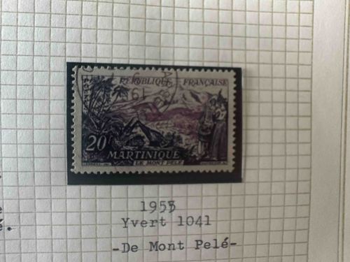 This item is a 20-Franc postage stamp from the French Overseas Department of Martinique. The stamp features a detailed landscape rendering of Mount Pelée (Le Mont Pelée), the infamous volcano near Saint-Pierre. It is part of a series showcasing the scenery and people of the island. The design is executed in a deep violet and black bicolored intaglio print on cream-colored paper. The stamp possesses standard perforations and is currently mounted on a black hingeless mount within a collector's album. The center-left features the value '20f' with the words 'REPUBLIQUE FRANCAISE' and 'MARTINIQUE' clearly visible. The artwork includes tropical vegetation in the foreground and figures on the right, providing scale to the volcano in the background. Included handwritten annotations below the stamp incorrectly suggest a 1955 date, though the 'Yvert 1041' identifier typically refers to the 1947 issue. The stamp appears to be in used condition, indicated by a circular date stamp (CDS) cancellation ink marking visible over the upper left and central portions of the design. The perforations appear largely intact, though a slight softening is visible at the lower left corner. The coloration remains strong with minimal fading, showcasing the high-quality engraving typical of French Colonial philately from the mid-20th century.