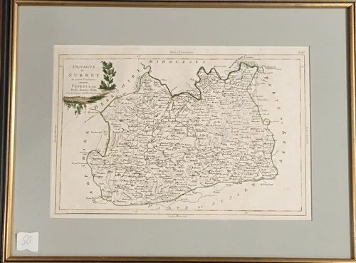 A fine 18th-century copperplate engraved map of the English county of Surrey, published in Venice in 1779. The map is titled 'Provincia di Surrey di Nuova Projezione' and was produced by Antonio Zatta for his monumental atlas 'Atlante Novissimo'. The piece is printed on hand-laid paper and features delicate hand-coloring, specifically in the decorative title cartouche which depicts a localized landscape with a tall tree. The map displays the county's boundaries with neighboring Middlesex, Kent, Sussex, Berkshire, and Hampshire. It shows towns, rivers, and topographic features with fine-line engraving typical of the Zatta workshop. The map is professionally presented in a double-ruled green-grey mat and set within a thin, gilt-finished wooden frame. Notable features include Italian nomenclature for the title and English names for the geographic locations. The condition appears to be excellent for its age, with minor expected toning to the paper and crisp plate marks still visible. There are no obvious signs of foxing, tears, or significant fading in the provided view. The craftsmanship reflects the high standards of late 18th-century Venetian cartography, known for its elegance and aesthetic appeal over absolute geographic precision.