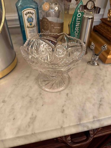 This item is an antique footed fruit or candy bowl crafted in the style of the American Brilliant Period (ABP), which spans approximately 1876 to 1917. The bowl is made of heavy, high-lead content clear glass, exhibiting a high refractive index and exceptional clarity. It features an intricate, deep-cut pattern consisting of notched prisms, hobstars, and feathered fans that are hallmarks of the period's craftsmanship. The rim is finished with a scalloped, sawtooth edge, while the pedestal base features an under-cut radial starburst pattern. Physically, the piece appears to be roughly 6 to 8 inches in diameter. The construction shows sharp, precise miters indicating hand-cutting on a stone wheel rather than modern pressed glass. In terms of condition, the glass appears bright with no significant clouding (sickness), though minor 'fleabites' or chips common to sawtooth rims may be present upon close tactical inspection. The craftsmanship is indicative of high-quality glass houses like Corning or Libbey, although no visible acid-etched signature is discernible in this view. This piece serves as a prime example of Edwardian-era luxury tableware, valued for its complex geometry and brilliant play of light.