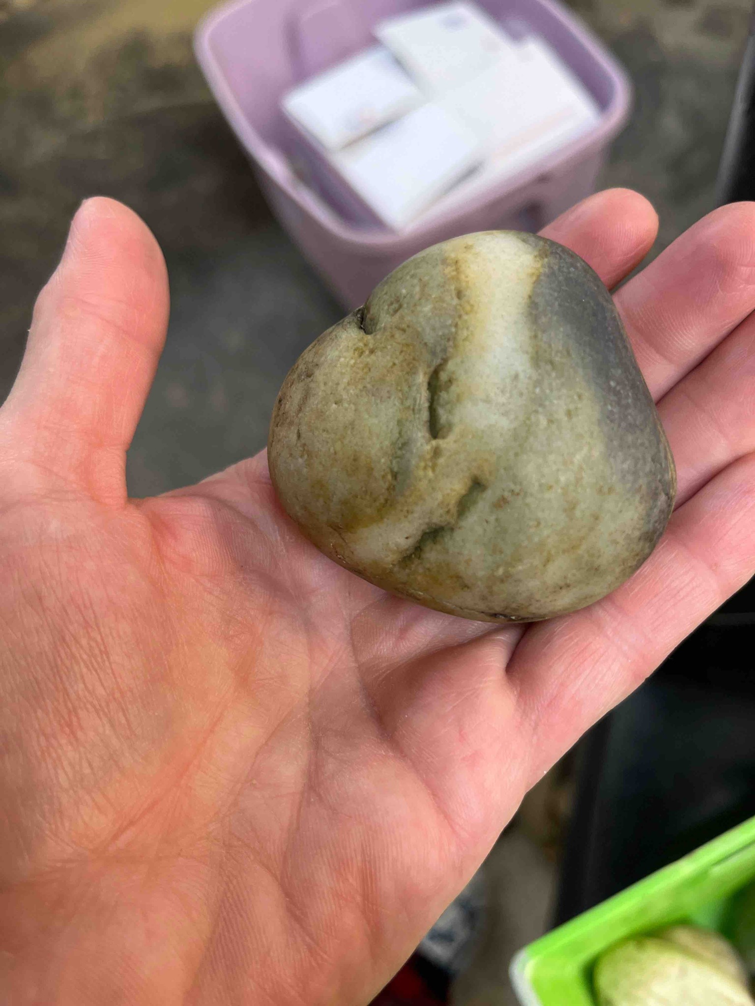 This is a naturally occurring water-worn river stone or cobble, measuring approximately 2.5 to 3 inches in length as compared to the human hand holding it. The stone exhibits a smooth, rounded surface indicating long-term fluvial erosion or glacial transport. The primary composition appears to be a fine-grained sedimentary or metamorphic host rock, characterized by a variegated color palette of olive green, tan, and dark charcoal grey. A prominent, thick band of milky white quartz Runs vertically through the specimen, indicating a geological history of hydrothermal mineral deposition within the parent rock. The surface shows some natural pitting and indentation particularly along the interface of the quartz vein and the host material. The condition is entirely natural with no signs of artificial polishing or human craftsmanship; it possesses a natural matte luster. There are no maker's marks or signatures, though the stone features a distinctive, almost heart-like silhouette in its rounded form. Small dark inclusions are visible throughout the greenish-tan segments, highlighting the complex mineralogy of the piece. Its age is geological, likely spanning millions of years, and it serves as an excellent example of natural physical weathering processes.