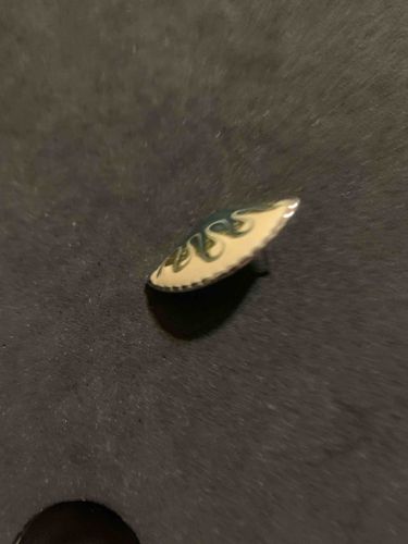 This item is a small, circularly domed lapel pin or brooch, likely dating from the mid-20th century (circa 1950s-1970s). The piece is constructed with a metal base—characteristic of enameled copper or 'copperware' art jewelry—featuring a convex shape that provides a sense of depth and dimension. The surface is decorated using a kiln-fired enamel technique, showcasing a marbled or 'sgraffito' petal-like pattern. The color palette consists of a dark teal or forest green center that bleeds into creamy off-white edges through wavy, organic lines. The rim displays a thin, exposed metallic edge, which is likely the underlying copper flashing through. On the reverse side, a standard pin-back fastener is visible, though the specific clasp type (whether a safety catch or a simple 'C' clasp) is partially obscured by the angle. The condition appears fair to good; there are no major cracks or chips visible in the enamel from this perspective, though there is a slight dullness to the luster suggesting age-appropriate wear and minor surface scratches. This style is highly reminiscent of the California mid-century modern enamel-on-copper movement, though no specific maker's mark is visible to confirm a high-end designer like Matisse Renoir or Bovano. The craftsmanship shows a hand-applied fluid aesthetic, common in artisan studio pieces of that era.