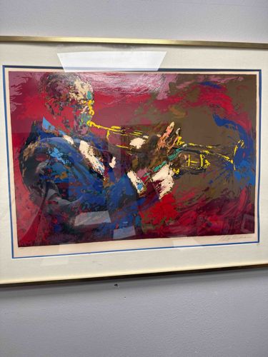 This item is a vibrant serigraph on paper by the renowned American artist LeRoy Neiman, depicting the jazz legend Miles Davis. The artwork measures approximately 24 by 36 inches and is characterized by Neiman's signature expressionistic style, featuring energetic, multicolored brushstrokes and a rich palette dominated by deep reds, blues, and yellows. The composition captures the intensity of the musician in profile, holding his trumpet with focused determination. The print is signed by the artist in the lower right-hand margin. It is housed in a contemporary gold-toned metal frame with a double-matted interior featuring a blue accent line that complements the artwork's tones. Notable condition issues include visible white tape or adhesive residue on the upper and lower portions of the protective glazing, which may indicate a need for professional cleaning or replacement of the glass. The paper itself appears to be in good condition without significant yellowing or foxing, suggesting it has been kept in a relatively stable environment. The quality of the printing shows high-definition layering typical of late 20th-century serigraphy. Neiman's works from the 1970s and 80s are particularly sought after for their dynamic portrayal of sports and music icons. This piece demonstrates superior craftsmanship in color registration and captures the kinetic energy for which the artist is internationally famous.