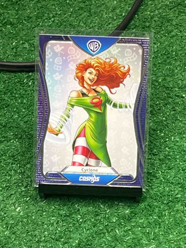 This is a modern collectible trading card featuring the character 'Cyclone' from the Warner Bros. (WB) universe, specifically part of the 'Cosmos' trading card series. The card features a vibrant, stylized illustration of a red-haired female character in a green tunic with a red 'S' emblem, set against a light background patterned with subtle icons like film reels and cameras. The central artwork is bordered by a distinctively shaped, multi-layered frame with a metallic or holographic purple textured pattern on the outer edges. The Warner Bros. logo is prominently displayed at the top center within a blue shield. The name 'Cyclone' is printed in a blue banner at the bottom, directly above the 'Cosmos' series branding. In terms of physical construction, the card appears to be standard sizing, likely 2.5 by 3.5 inches, with rounded die-cut corners within the frame design. The card is protected by a clear plastic penny sleeve and is supported by a small black display stand. The condition appears to be excellent or 'Near Mint' based on a visual inspection, showing no immediate signs of corner wear, surface scratches, or factory defects, though a full appraisal would require out-of-sleeve inspection under magnification. The printing quality is high, with sharp lines and saturated colors, typical of modern high-end collectible card games or trading card sets produced in the 2020s.