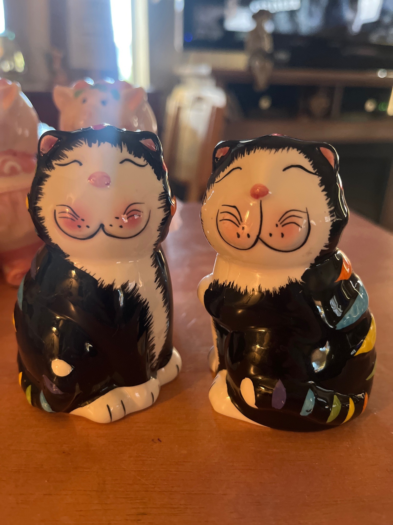 This is a whimsical pair of ceramic salt and pepper shakers designed in an anthropomorphic 'happy cat' style. Each figure stands approximately 3 to 4 inches tall and features a high-gloss glazed finish. The cats are depicted in a tuxedo pattern—primarily black bodies with white chests, white paws, and white facial masks. A distinctive decorative element is the inclusion of multi-colored, teardrop-shaped spots (purple, blue, orange, yellow, and green) adorning the sides and tails of the cats, adding a folk-art or whimsical touch. The facial features are stylized with closed, happy 'crescent moon' eyes, pink triangular noses, and rosy cheeks with black whisker dots. The ears are lined with a soft pink glaze. From a construction standpoint, the items are mold-poured ceramic with hand-painted details, characteristic of mass-produced giftware from the late 20th century (likely 1980s-1990s). The figurines appear to be in excellent used condition with no visible chips, cracks, or crazing in the glaze. The gloss is bright and reflective, indicating minimal surface wear. While no specific maker's mark is visible in the primary image, they are stylistically similar to items produced by companies like Ganz or Otagiri, which specialized in novelty ceramics during that era.