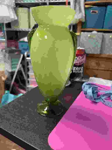 This item is a decorative Mid-Century Modern style glass vase, featuring a distinct lime or chartreuse green hue. The vessel is constructed in a footed urn silhouette, characterized by an elongated ovoid body that tapers significantly toward a circular, pedestal-style base. At the top, the piece transitions into a wide, flared rim with a soft, rounded lip. A notable feature of this vase is the presence of two integrated, fin-like glass handles or 'wings' that run vertically along the upper sides of the body, suggesting a mid-to-late 20th-century design influence, likely inspired by Viking or Blenko glass aesthetics. The color presents as a vibrant, translucent lime green with a deeper forest green tone visible in the thicker glass sections of the base and handles. The surface appears smooth and glossy, indicative of a high-quality hand-blown or mold-blown process. There are no immediate signs of large cracks or chips visible in the image, though the base likely shows minor shelf wear typical of its age. The item stands approximately 10 to 12 inches tall based on the scale of the soda can in the background. No visible maker's marks or signatures can be identified from this angle, but the craftsmanship suggests a mass-produced decorative piece for mid-century American households.