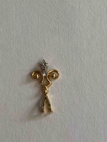 This item is a decorative pendant featuring a stylized fleur-de-lis or ornamental scroll motif. It is constructed from two-tone metal, likely 10k or 14k yellow and white gold. The main body of the pendant is crafted in polished yellow gold, showcasing two outward-facing scrolls flanking a central vertical axis and terminating in a v-shaped bail at the bottom. The top portion features a diamond-shaped white metal element, possibly rhodium-plated gold or platinum, accented with three small round indentations that may once have held melee diamonds or are intended as milgrain-style decorative beads. The overall length is estimated to be approximately 15-20mm. The condition appears fair to good; there is visible surface wear and slight dulling of the polish consistent with age and frequent handling. No hallmark or clear maker's stamp is visible in this orientation, but such marks would typically be located on the reverse side. The design suggests a late 20th-century aesthetic, likely manufactured between 1980 and 2000. The craftsmanship displays mass-produced commercial quality with cast assembly rather than hand-forged intricacies.