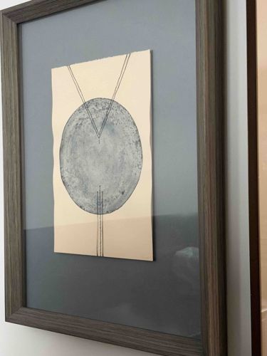 This is an original contemporary artwork by the acclaimed Inuk artist Niap (Nancy Saunders). The piece features a central, orb-like form rendered in a textured blue-grey wash, possibly ink or watercolor, on a rectangular sheet of off-white art paper with distinctive deckled or hand-torn edges. The composition is bisected by fine, sharp black lines resembling traditional Inuit tattoo patterns (kakiniit), with converging lines at the top forming a 'V' shape and parallel vertical lines at the base. These minimalist geometric elements are characteristic of Niap's style, which often explores Inuk identity and traditional practices through a modern lens. The paper shows slight undulations consistent with hand-applied wet media. It is professionally float-mounted against a slate-grey mat, creating a three-dimensional effect that showcases the paper's raw edges. The artwork is housed in a modern grey wood-grain finished frame with clean mitred corners. The condition appears excellent with no visible foxing, staining, or UV damage to the pigments. The execution displays high-level craftsmanship, balancing technical precision in the linework with organic fluidity in the central circle. Based on the artist's career trajectory, this piece likely dates from the mid-to-late 2010s to the early 2020s.