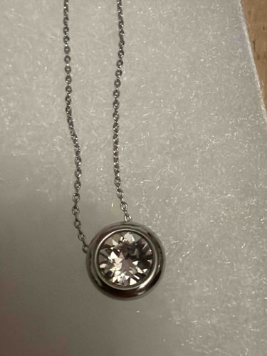 This item is a contemporary solitaire pendant necklace featuring a round brilliant-cut colorless stone, which appears to be either a high-quality cubic zirconia or a lab-grown diamond based on its intense fire and clear facet definition. The stone is securely housed in a full bezel setting, characterized by a smooth, rounded silver-toned metal rim that encapsulates the perimeter of the gemstone. The metal has a high-polish finish and exhibits the bright, white luster typical of sterling silver, white gold, or platinum. The pendant is integrated into a delicate cable link chain, where the links are uniform and oval-shaped. The construction follows a minimalist 'slider' or 'stationary' style common in modern fine jewelry. Regarding condition, the metal surfaces show very minor micro-scratches consistent with light wear, but there is no significant tarnishing or structural deformation visible. The stone appears eye-clean with no visible chips or surface abrasions on the table. No maker's marks or hallmarks are visible in the provided image, though they would likely be found on the lobster or spring-ring clasp or a small tag near the closure. The style is timeless and suggests a manufacturing date within the last 10 to 15 years, reflecting a clean, architectural aesthetic focused on showcasing the central stone's brilliance.