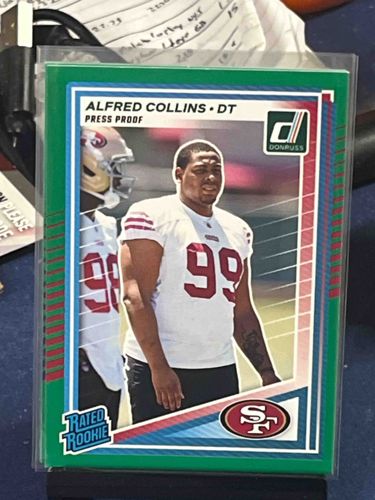 This is a 2020 Donruss Football 'Rated Rookie' trading card featuring Alfred Collins, a Defensive Tackle (DT) for the San Francisco 49ers. The card is a 'Press Proof' parallel, distinguished by its vibrant green border, which is a common retail-exclusive variant. The central image shows Collins in a white practice jersey with the number 99, with another player partially visible in the background. The design includes the iconic 'Rated Rookie' logo in the bottom-left corner and the Donruss 'd' branding in the top-right. The San Francisco 49ers team logo is prominently displayed in a circular emblem at the bottom right. The card is printed on standard cardstock and is currently protected within a clear plastic sleeve. Physical condition appears good with sharp corners and clean edges visible through the sleeve, though surface scratches on the plastic itself may obscure fine details of the card's surface. The centering appears slightly heavy toward the left margin. This card is a modern sports collectible from the Panini America era, specifically catering to fans and team set collectors of the 49ers.