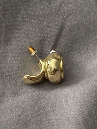 This item is a single, chunky gold-tone earring designed for pierced ears. The earring features a bold, bulbous, or 'shrimp' style silhouette with vertical ribbing or banded details that create a dimensional, architectural aesthetic. It is constructed from a polished yellow metal, likely gold-plated base metal or high-quality costume jewelry alloy, exhibiting a bright, reflective finish. The earring utilizes a post and butterfly-style clutch back for secure fastening. The overall design suggests a late 20th-century influence, specifically the 1980s or 1990s, when large, sculptural gold-finish jewelry was highly fashionable. In terms of condition, the metal shows minor surface scratches and evidence of light wear consistent with age, though the gold tone remains vibrant without significant pitting or green oxidation. The post appears straight and the clutch back is present, indicating the piece is functional. There are no clearly visible maker's marks or hallmarks in this view, though they may be located on the interior side of the curve or the clutch itself. The craftsmanship is clean, with smooth transitions between the curved sections, typical of mass-produced yet high-quality fashion jewelry of its era.