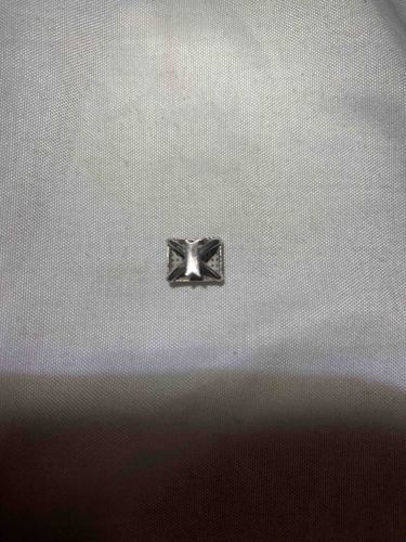 This item is a small, silver-toned metal component that appears to be the setting head from a stud earring or a piece of costume jewelry. It features a rectangular or square perimeter with a geometric 'X' shaped support structure across the center designed to hold a stone. The metal exhibits a bright, reflective luster consistent with sterling silver, white gold, or rhodium-plated base metal. A notable feature is the stippled or textured finish on the interior floor of the setting. The construction is a modern mass-produced style, likely contemporary or within the last 20 years. Regarding the condition, the item is fundamentally incomplete and 'broken' as per the user context; it is missing the primary gemstone or crystal that would normally sit within the prongs, and the post or bale for attachment is absent. There are visible dark spots which could be shadows or minor tarnish, and some slight distortion in the prong alignment, suggesting mechanical stress prior to the loss of the stone. The craftsmanship is of standard commercial quality with no visible maker's marks or hallmarks on this specific fragment.