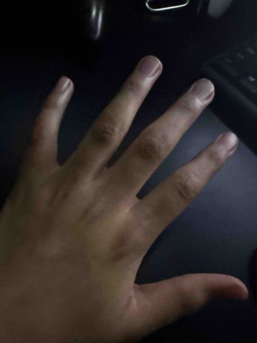 This item is a digital photograph depicting the dorsal view of a human right hand, oriented with digits extending toward the top of the frame. The subject possesses medium-toned skin and five visible digits including a thumb. The fingernails appear short, natural, and unpolished, showing a standard biological shape without significant ridges or discoloration. Physically, the hand is set against a dark, low-light background which creates a moody, high-contrast aesthetic. To the right of the hand, the corner of a black computer keyboard is partially visible, and an elliptical metallic object, possibly a ring or handle, is seen in the upper background. The lighting is directional, originating from the right side, casting soft shadows across the knuckles and the back of the hand. No jewelry, watches, or visible scars are present, suggesting a youthful or early adult age for the subject. The photograph's composition is informal and amateur in nature, captured from an overhead perspective. The condition of the skin appears healthy and well-maintained with no obvious dermatological issues, though the low resolution of the image obscures fine detail such as fingerprints or pores. The term 'cut off hand' in the context likely refers to the photographic framing rather than physical trauma.