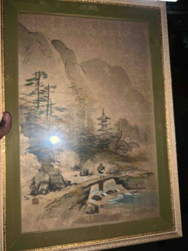 This is a vintage framed East Asian landscape painting, likely Japanese or Chinese, executed in a traditional ink and wash style on paper or silk. The composition features rhythmic mountain peaks, a multi-tiered pagoda, pine trees, and a lone figure crossing a small bridge over a stream. The color palette is muted, dominated by earth tones, greys, and subtle washes of green and blue. A red seal or 'chop' mark is visible in the lower left corner, indicating the artist's signature or studio. The artwork is housed in a mid-20th-century frame featuring a double-mat style: a wide olive-green inner border and a textured, off-white outer frame with a thin gold-toned interior lip. In terms of condition, there is visible foxing and discoloration across the paper's surface, particularly near the top, which is common for antique works on paper. The frame shows some minor edge wear and dust accumulation. The craftsmanship displays classic atmospheric perspective and delicate brushwork characteristic of Showa-era or early modern orientalist décor, reflecting a mid-to-late 20th-century aesthetic intended for global export or high-end domestic use.