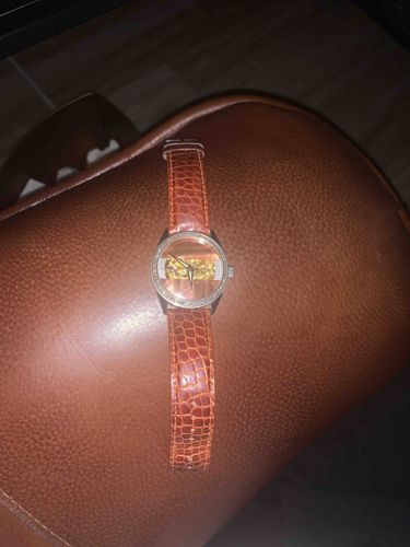 This is a Corum 'Golden Bridge' style wristwatch, a highly distinctive model in horological design. The watch features a circular silver-tone case, likely crafted from white gold or high-grade stainless steel, which is embellished with a bezel set with small, brilliant-cut diamonds. The focal point of this timepiece is the linear movement, visible through the center of the dial with horizontal copper and gold-colored plating. This 'Golden Bridge' movement aligns the barrel, gear train, and escapement in a single vertical row, serving as both the mechanism and the dial's aesthetic center. The hands are gold-toned and tapered. It is paired with a vintage cognac-colored crocodile or alligator leather strap, showing a high level of craftsmanship in the textured scales and stitched edges. The condition appears well-preserved with some minor patina on the metal surfaces and softening and light creasing of the leather strap consistent with age and occasional wear. The style suggests a manufacturing period in the late 20th century, likely the 1980s or 1990s, characterized by this specific avant-garde transparency. Notable quality indicators include the precision of the diamond setting and the rare linear movement architecture patented by Corum.